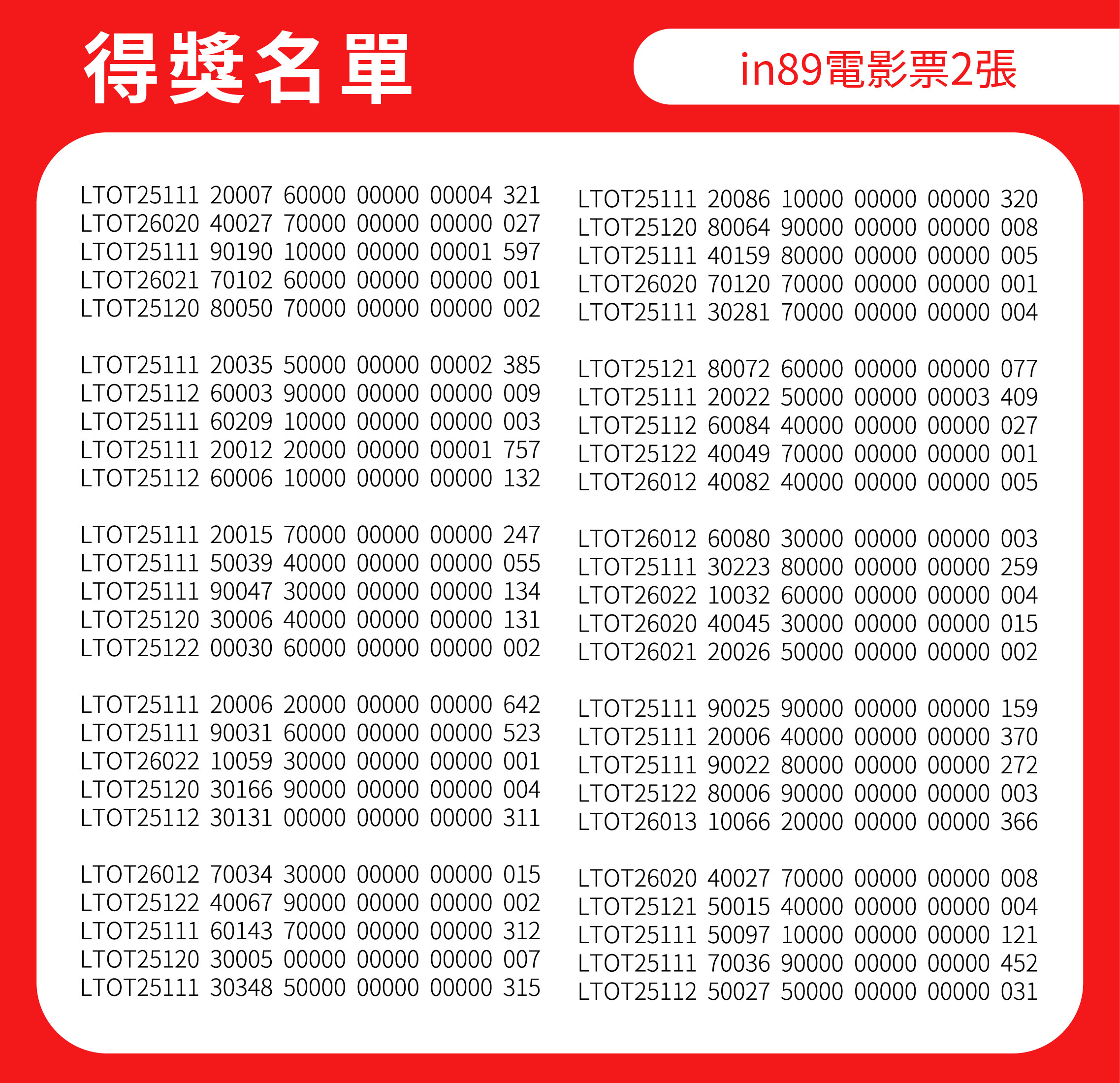 | 2026/3/1 | in89電影票2張 | 詳細中獎序號請見下圖名單 | 100名 | 即日起~2026/3/14止 |