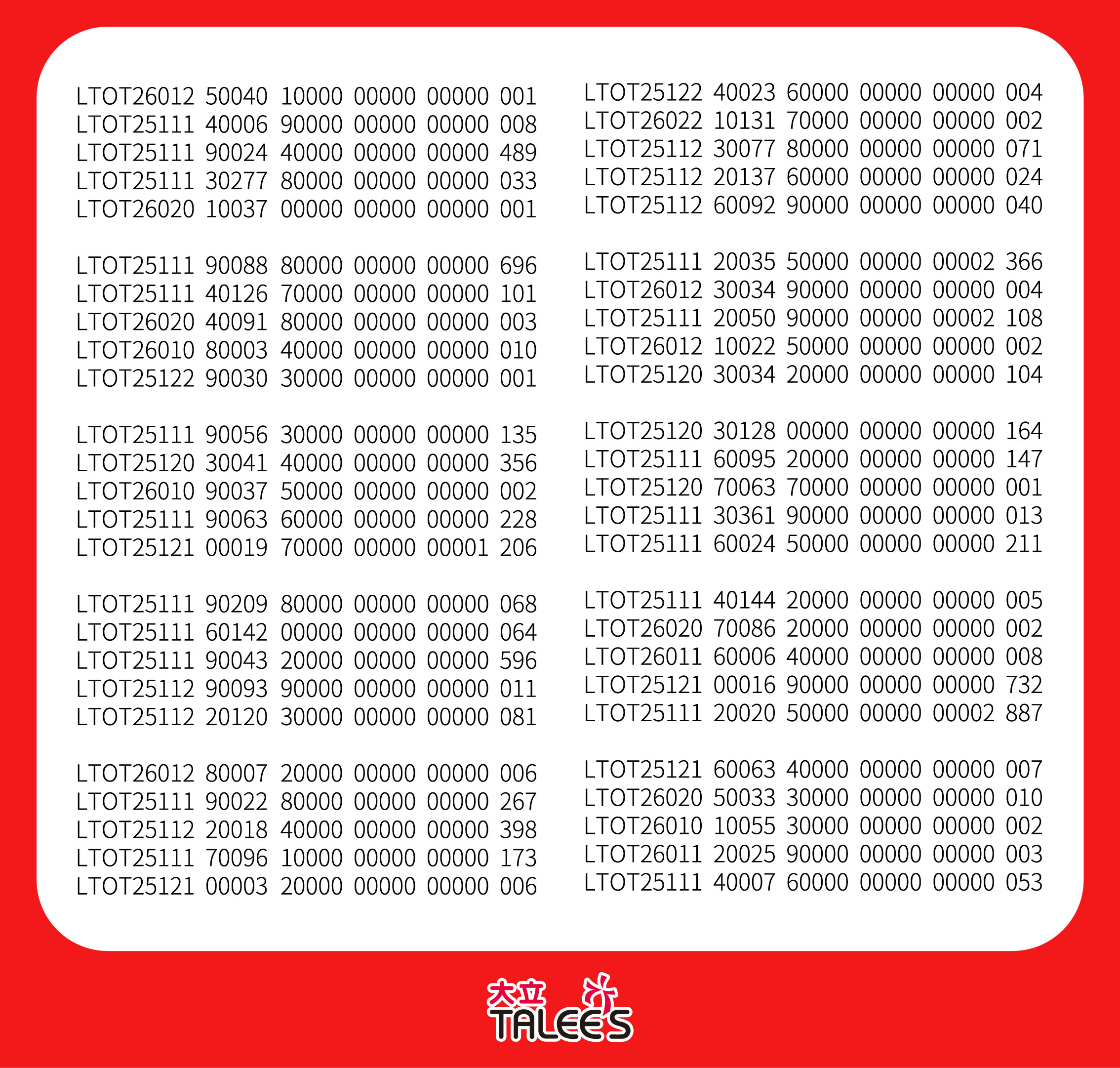 | 抽獎日期 | 抽獎項目 | 中獎序號 | 名額 | 兌獎期限 |
