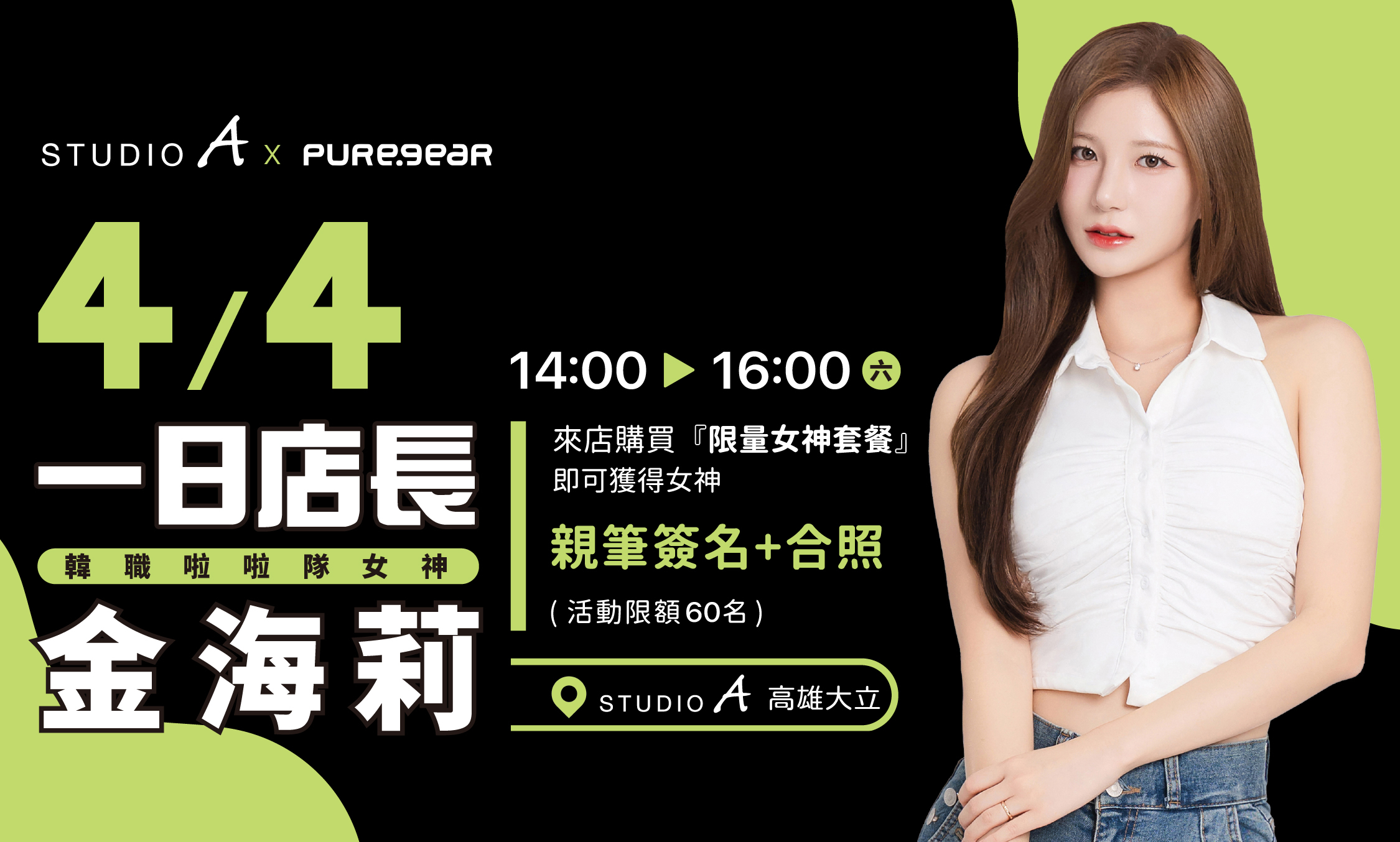 現役韓國職棒啦啦隊女神 金海莉 將於 4 月 4 日親臨高雄大立,於 STUDIO A 專櫃擔任一日店長,與粉絲近距離互動交流,帶來難得的見面機會。